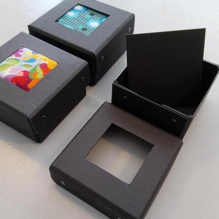 Lille, bitte og fin til små broderier. Æsken måler 9 x 9 cm og har passepartout i låget på 5 x 5 cm.